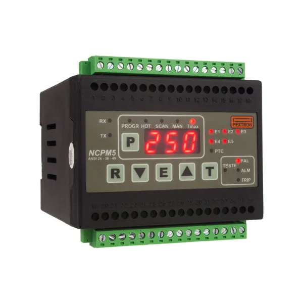 Relé de proteção térmica de motores elétricos tipo NCPM 5, com 5 sensores RTD Pt100Ω ( 3 fios DIN 43.760) com operação na faixa de 0 … 249 0C e 9 sensores tipo PTC