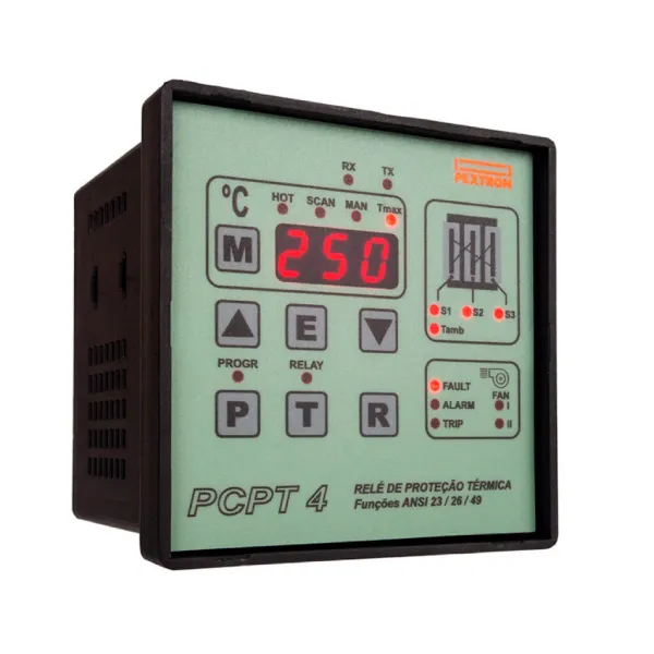 Relé de proteção, controle e monitoramento térmico de transformadores a seco, modelo PCPT4 através 4 sensores RTD Pt100Ω – 3 fios DIN 43.760 (faixa de 0 a 250ºC), podendo ser aplicado em outras máquinas como inversores de frequência para controle de velocidade de motores.