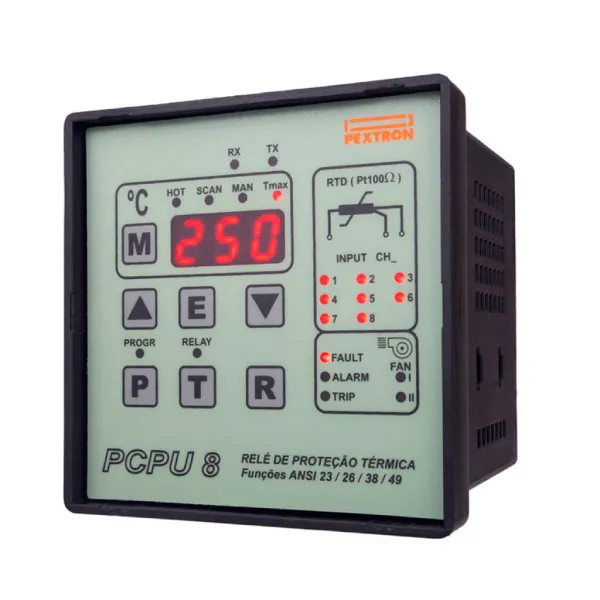 Relé de proteção, controle e monitoramento térmico de máquinas elétricas modelo PCPU8, através de 8 sensores RTD Pt100Ω – 3 fios DIN 43.760 (faixa de 0 a 250ºC). Encontra aplicação em máquinas como motores elétricos, inversores e outras máquinas elétricas / térmicas.