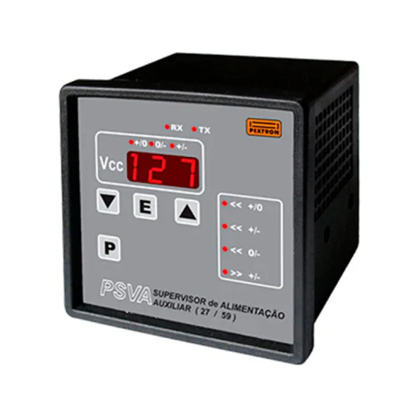 Relé de proteção de tensão em corrente contínua tipo PSVA, para supervisão de tensão contínua para alimentação auxiliar e proteção de fuga à terra em bancos de baterias e retificadores de subestações.
